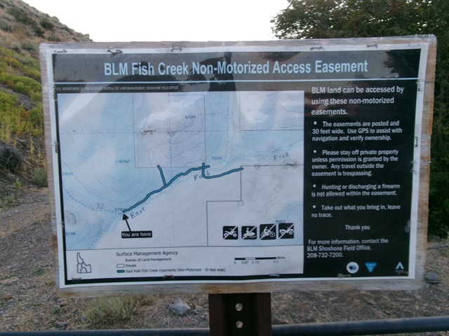 The BLM easement map for East Fork Fish Creek Road from the road closure point. About a mile up from here, the area is private land and is closed to the public. No access to Blizzard Mountain. Livingston Douglas Photo