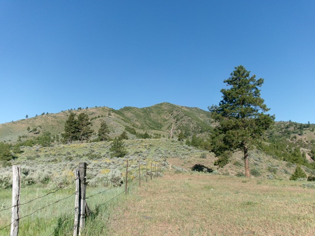 Krall Mountain (dead center), its east ridge (skyline left of center), and the initial fence row to follow. This is the view from the start of the climb. Livingston Douglas Photo
