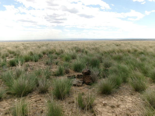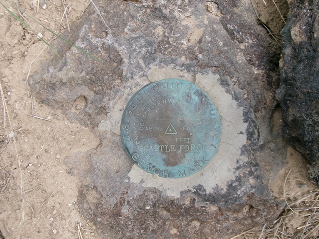 From the road bend, bushwhack west up a rounded shoulder of gapped sagebrush. Once atop this shoulder (at its west end), angle right-ish/west-northwest for a ways and cross a wide gully of sorts. Aim northwest now toward two visible water tanks. Bushwhack through typical sagebrush with gaps to reach the water tanks. Once past the water tanks, find an old 2-track service road that leads west to an old radio tower. Follow an old 2-track road from the radio tower to its end then bushwhack west in thick-ish sagebrush to reach the summit area. Look around and find the USGS benchmark high point of Castleford Butte.