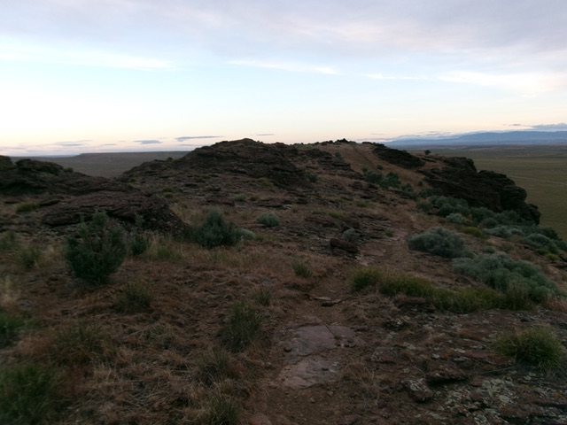From the 3,530-foot connecting saddle with Twin Buttes, East, follow a good foot trail northwest up the right/northeast side of the ridge crest all the way to the summit. The high point is a large ground boulder with a modest cairn atop it. It is located at the far northwest end of the high ridge, where the ridge begins to descend to the northwest.