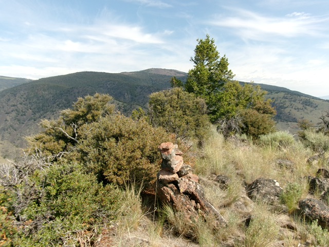 Either stay on the laborious ridge crest (or near it) OR skirt it higher up near Point 6607 and remain in open scrub on the edge of the forest to reach the forested summit hump. Bushwhack up through the easy pine forest to find the rocky summit crest and the cairned high point at its northwest end. I stood atop another high boulder/outcrop to its southeast of very similar height. The summit area is a nasty mix of boulders/outcrops and mountain mahogany.