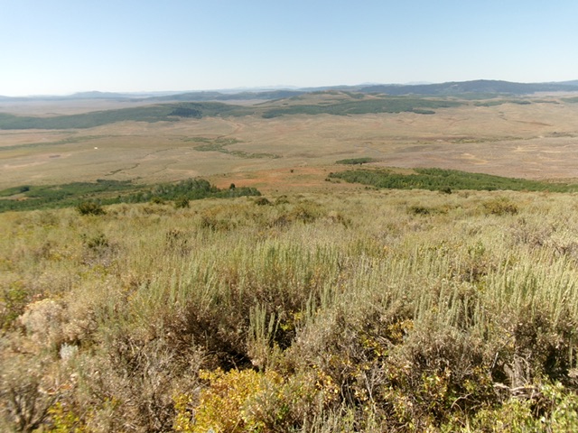 From Exit 116/Sunnyside Road on I-15 in Idaho Falls, drive east on Sunnyside Road all the way to its end at a “T” junction with Bone Road. Drive south on Bone Road for 0.1 miles to a signed junction with Eagle Pass Road. Go left/east on Eagle Pass Road (which soon merges into Kepps Crossing Road) and drive 8.3 miles to a signed junction with Dan Creek Road. Reset your odometer here. Turn right/south onto Dan Creek Road and drive 16.7 miles to a bluff/ridge crossing. Park here [6,332 feet; 43°14’22.3”N, 111°33’38.4”W].