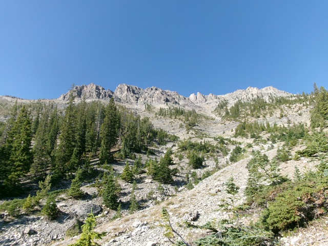 As you gain elevation, the forest thins out and the terrain becomes rockier. The terrain on the shoulder is a mix of scattered pines, loose scree/gravel, some ground boulders and rocky outcrops, and patches of tundra. It is steep and loose and requires grabbing the pines to advance in some areas (Class 3). The gully to your left/south will eventually be your ticket to the summit ridge. High up, the northeast shoulder reaches a headwall of rocky towers. Go left/south just under these towers and cross into the center of the prominent gully. Stay in the center for the best footing on tundra and embedded ground rock/slabs.