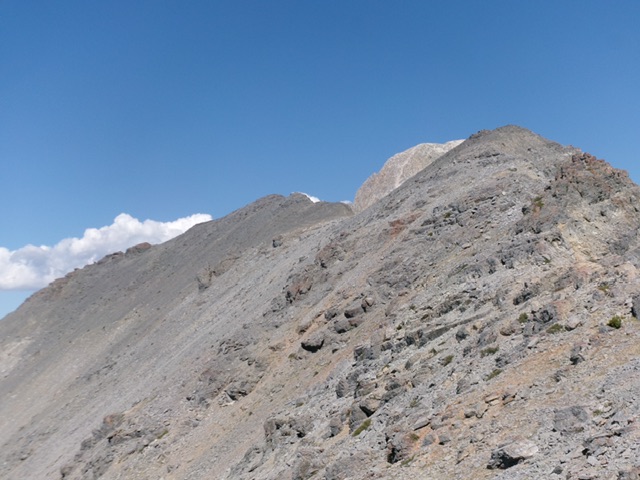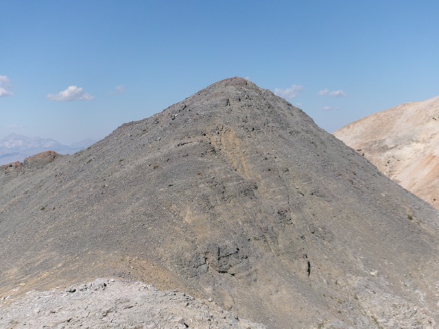 The gully leads directly to the summit ridge. This section of the climb is quite steep but it goes at Class 3 at worst. Upon nearing the top of the gully, move left/southeast up a final section to reach the ridge crest. Once on the rocky east ridge, scramble northwest past a few ridge towers. Climb over the east summit (which is 30 feet lower than the true/west summit) then descend loose talus/scree for 50 vertical feet to a notch. From the notch, continue west up an easy pile of talus/scree to reach the cairned summit of The Clapper. This concludes the first leg of today’s 2-peak adventure. Goats ‘R Us (10,577 feet) is up next.