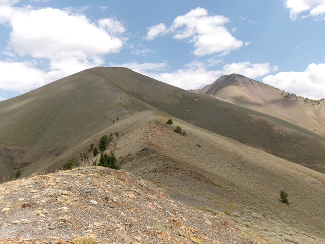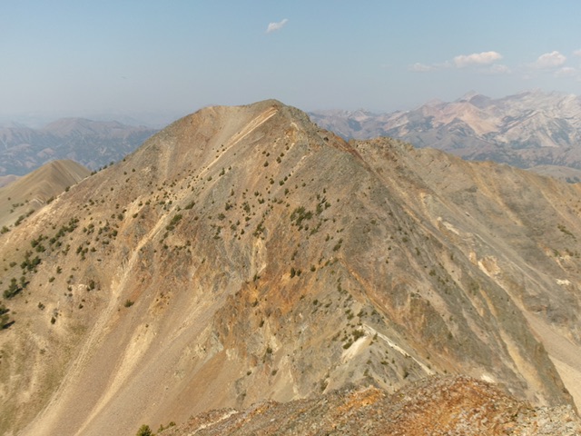 Only the summit cap is Class 3. From the summit, descend southwest in steep ridge rock (Class 3 downclimbing) then steep, loose talus/scree (Class 3) to reach a gentle ridge saddle with Point 10249 to the west. Continue west along the easy ridge crest of short scrub and scree up to another saddle that is 20 feet higher. From this saddle, leave the ridge and contour southwest then west to skirt underneath Point 10249. This is a bit challenging early on with loose, angled scree/gravel with only a little help from the scrub. Descend about 20 vertical feet in this section and cross a gully.