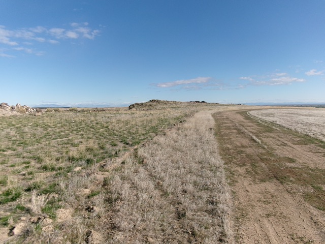 I also investigated the east summit since it is of similar height. The east summit is on the east rim and is much easier to reach, mostly via a 2-track road that runs north alongside irrigated farmland to the east. A short scramble leads to the rocky east summit. My altimeter measured the west and east summits of equal height but the USGS map shows a higher contour for the west summit.