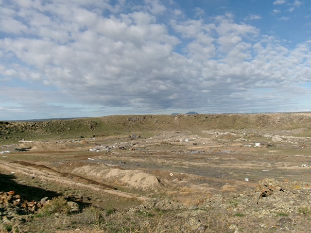 The official high point of Butterfly Butte sits on the southwest rim of the crater. From the pullout at the road junction, scramble west along the south rim then northwest briefly to reach the unassuming high point. The terrain is a mess of rocky berms, sagebrush and other scrub, tumbleweeds, boulders, bulldozed sections, and gaps. The summit is rocky. The bottom of the crater is filled with all kinds of refuse. Not a pretty sight.