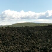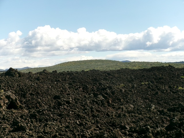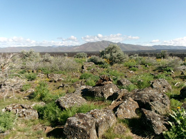 Head northeast, following the right/south side of toe of the lava fields (tall cairn here) until the sagebrush ends. Begin the inevitable lava rock scramble now. Head northeast then north-northeast and aim directly at the sagebrush hump in the distance, which is Carey Kipuka. After toiling in the up-and-down lava blocks, talus, and ground slabs/fingers of lava (with gullies/gaps along the way), drop to a wonderful field of sagebrush.