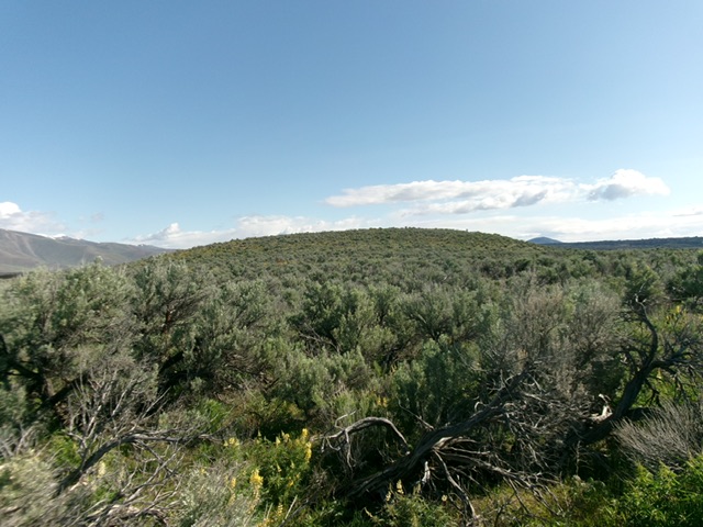 From the end of the 2-track road, bushwhack east-northeast up a wide gulch that is a continuation of the road’s direction (the USGS topo map shows the road still here but it is long gone and there are no remnants of it). Follow a cattle/use trail initially which soon disappears. Upon approaching the lava fields at the head of the sagebrush gulch (the sagebrush is a bit thick in areas but is not too difficult), move right/southeast to stay in the open sagebrush for a bit longer and avoid the tedious lava rock.