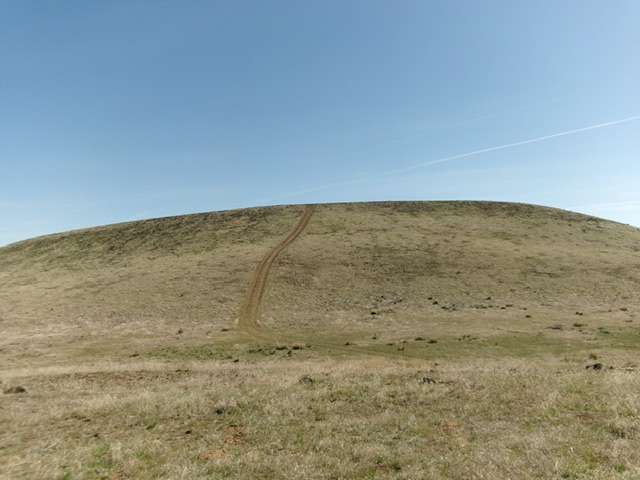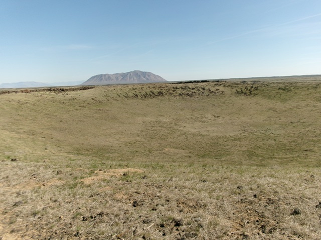 From the bluff, drop slightly (15 feet) to cross a dry gully on a 2-track and then follow the 2-track as it climbs STEEPLY north up the south face to reach the crater rim. Head right/east to the southeast summit (the official LOJ high point), which has a summit cairn. Continue all the way around the crater rim (on mostly easy short grass and scrub) counter-clockwise. Contrary to LOJ, the rocks on the northeast side of the crater rim seem to be the actual high point.