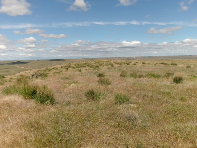From Bell Rapids Road, bushwhack west then southwest to reach the edge of a butte of sorts. Descend southwest down gravel and field grass to cross the undulating valley floor. From the valley floor, scramble southwest up to the tilted summit area. The terrain is mostly field grass but has standard sagebrush on the summit and on the initial “butte.”