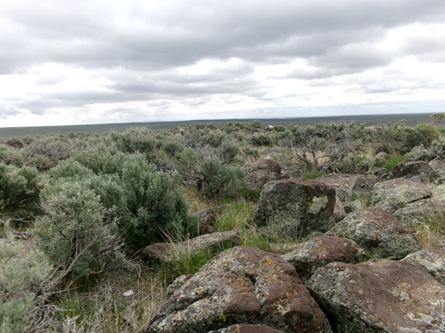 From the side road north of the ridge crest, walk 0.2 miles south on ID-51 to the road crest and the west ridge. Leave the highway and bushwhack east through sagebrush to reach the summit boulders/brush. The gravel pit offers a shorter, less-brushy climb to the summit area and that is the route I recommend.