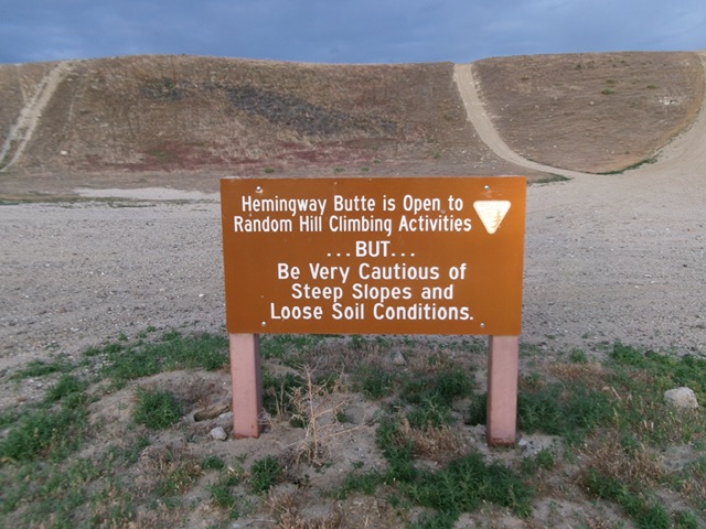 From the trailhead parking area, hike up a steep ATV trail on the east face. If necessary, scramble up the short grass/scrub next to the ATV trail for better footing. Once on the ridge crest, follow an ATV trail right/northwest to the first high ridge. Continue on to a second, slightly-higher ridge after dropping 20 vertical feet to cross a gully. Once on the second ridge, leave the ATV trail and scramble a short distance left/west (or northwest) to the sagebrush summit area that is the high point of Hemingway Butte.