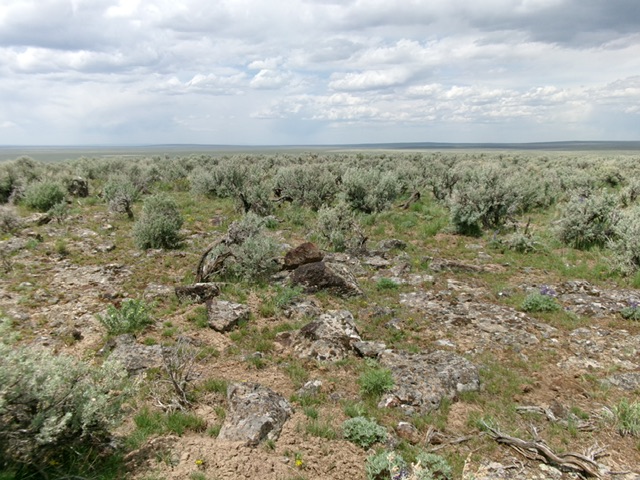 From the unsigned road junction, hike south up the rugged 2-track road to reach a saddle between the southwest summit hump and the northwest summit hump. Head right/southwest here and bushwhack through thick-ish sagebrush to reach the semi-open summit area of Horse Hill. There is no summit cairn and I was unable to find the Big Flat USGS benchmark. Stand on the highest ground boulders to satisfy yourself that you have conquered the high point of Horse Hill.