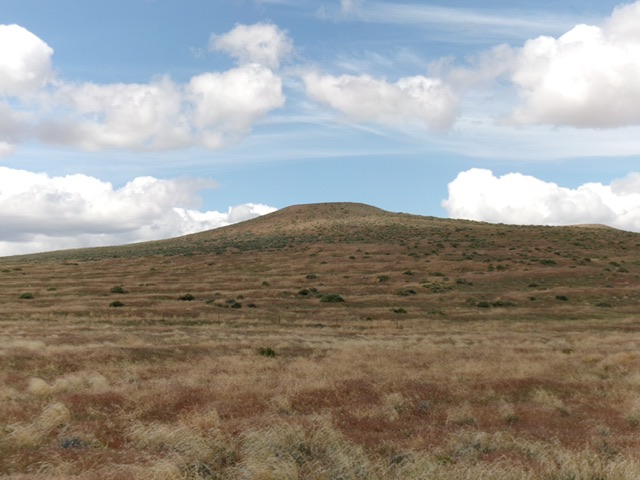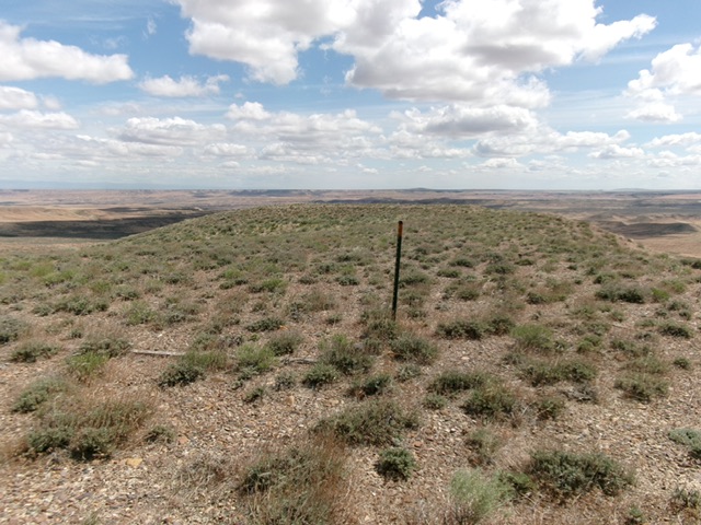 From Blackstone-Grasmere Road, bushwhack southwest then west through grass and tumbleweeds, crossing knolls and gullies. Climb up a final shoulder/face to reach a high ridge. Head left/south on this narrow, grassy ridge then right/west to the high point of Horse Hill. The summit has a metal post and two USGS benchmarks atop it. This bushwhack requires lots of ups and downs and endless tumbleweeds that will tangle up your feet/boots. Be patient. When you first see the hill, it appears a long ways off but the terrain goes faster than you expect. The summit of Horse Hill is the southernmost of several high ridge points as the USGS map shows.