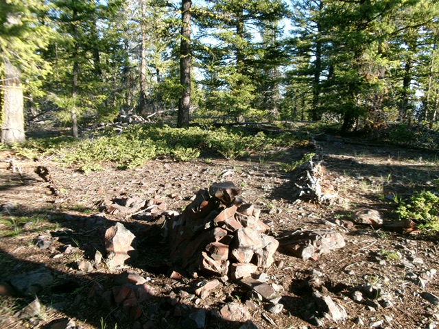 Higher up, the terrain has a rockier base and the pine forest is thicker with much more blowdown. The slope eases considerably and the ridge bends right-ish/southwest. The forested summit plateau begins here. Scramble through endless blowdown, heading southwest then curling right-ish/west then northwest to reach the highest hump. I found a liquor bottle and a small cairn on the high point. I built a nice summit cairn here. Due to the pine forest, there are no views from the top.