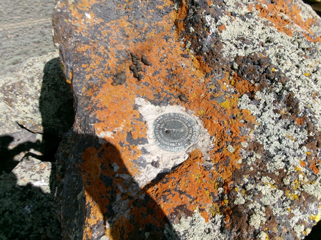 Bushwhack through reasonable, sometimes tall, sagebrush in cattle trails to get underneath the rocky crater rim. Scramble up onto the ridge (crater rim) on the east/southeast side of Pinhead Benchmark to reach the blocky summit. A pole and wind gauge sits on the summit block. The primary Pinhead Benchmark is gone but a secondary benchmark is still there. From this official LOJ summit (the southeast summit) of Kettle Butte, descend northwest to a 2-track road in the crater area and follow it briefly left/north (this road is shown on the USGS map).