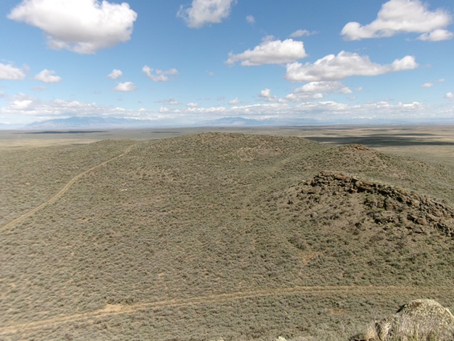 From the northwest summit, descend southwest then south-southwest through reasonable, gapped sagebrush to intercept the 2-track ascent road near an open, cattle-gathering area. Follow a side road south briefly to find the main 2-track road that leads west back to the junction and your parked vehicle.