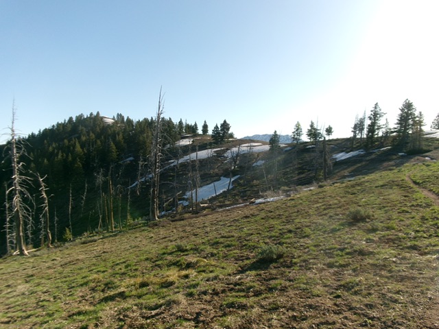 Go left/northeast for FST-125. Go left/northeast here and follow the trail northeast then north up to the east side of the summit hump. Leave the trail when it crests just before passing well below the rocky, forested summit hump. Scramble west up onto the crest of the southwest ridge and follow it to the high point OR angle northwest up snow-free slopes to just under the rocky summit then scramble briefly west to the high point. The summit has a USGS benchmark but had no summit cairn, so I built one.