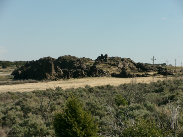 Massacre Rocks as viewed from the road to its southeast. The east tower is at far right and is the actual high point of Massacre Rocks. Livingston Douglas Photo