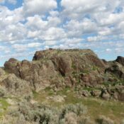 From the cattle gate (easily opened), scramble west through field grass and scrub to reach a middle area between the east towers and the gentler west ridge area. Scramble up onto the exposed, highest east tower (Class 4). Contrary to LOJ’s placement on the west ridge, I believe that the highest east tower is the high point of Massacre Rocks.