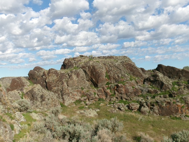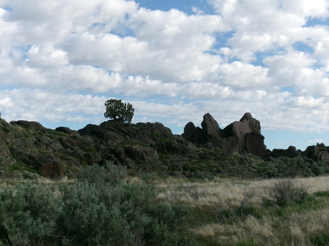 Massacre Rocks is a handsome, rocky set of outcrops located along I-86 and just south of Massacre Rocks State Park. The summit area is easily accessible from a side road on the southeast side of I-86. While LOJ shows Massacre Rocks on private land, it seems to be readily accessible to the public via a cattle gate on its east side. There is no signage to prohibit entry. USGS Neeley