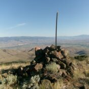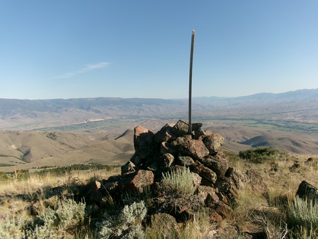 The large cairn and post atop Mill Benchmark with the town of Salmon in the distance. Livingston Douglas Photo