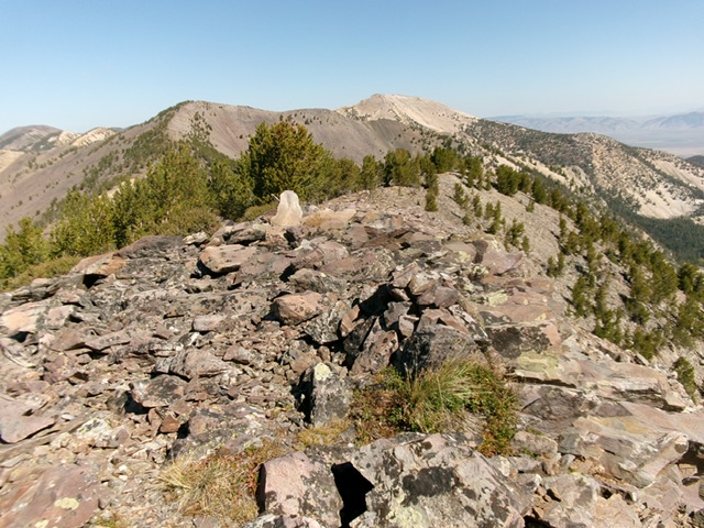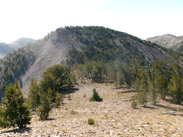 From the 9,860-foot connecting saddle with Peak 10336, scramble southeast up a steep-ish, loose ridge of scree/gravel and a few scattered pines. Use zig-zagging goat trails to help advance up this section. Once on the easier summit ridge crest, head right/south through a pine forest and easy ridge rock to reach the high point of Peak 10177 at its south end. I built a nice, new summit cairn on the highest point.