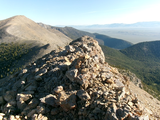 Move slightly left/south near the top to advance through a few rock strata and reach the ridgeline summit. The high point is just right/north of the top of the east ridge, which is a ridge corner. I built a nice cairn atop the highest boulders. The summit offers a magnificent view of the surrounding peaks (Rainbow Mountain, Mount Perspiration, Bell Mountain).