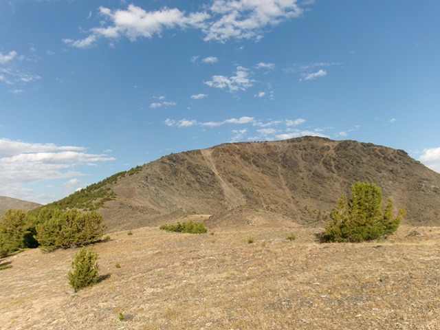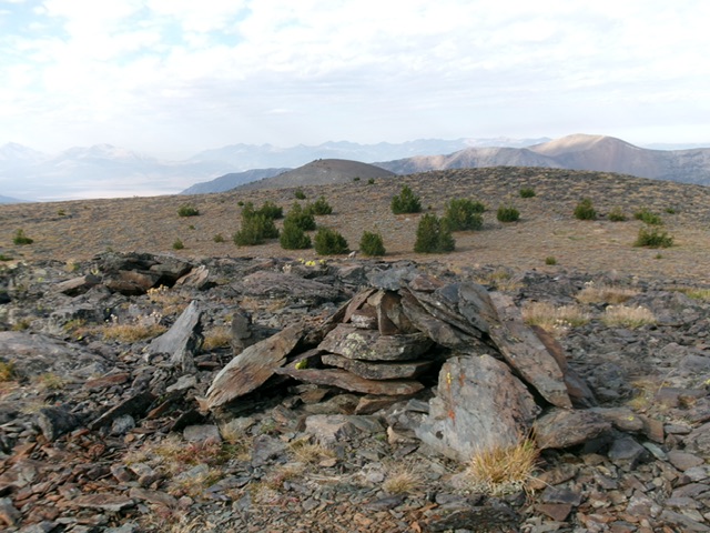 The ridge does a final rocky bend right-ish/north after crossing a false summit hump. The high point of Slate Roof Peak has two large summit cairns only 10 feet apart. The cairn on the right/east edge seems slightly higher. There is lots of dinner-plate shale with which to build summit cairns.