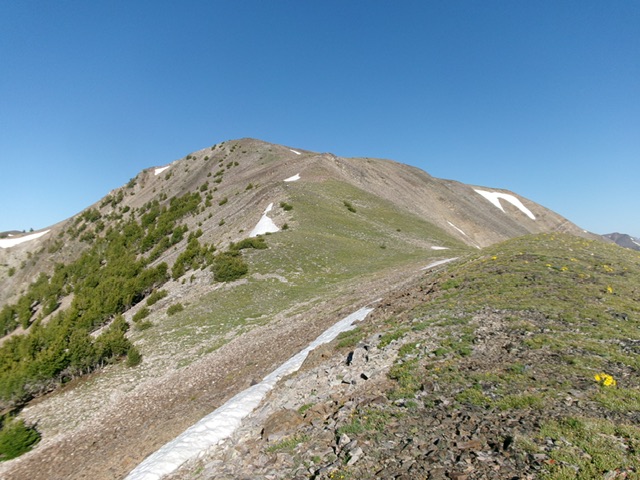 Follow this climber’s trail briefly as it heads northwest then west. Leave the trail and bushwhack northwest then west up through steep, but reasonable, pine forest to find a ridge/shoulder that heads left/northwest. This climb is in a mix of pine forest, a few open (or semi-open) areas, and some patches of boulders/talus. Reach a grassy, flat open bench at about 9,800 feet. Move to its left/west side then scramble diagonally right/northwest up through talus then easy pine forest. Skirt a rocky hump and reach the crest of the east ridge.