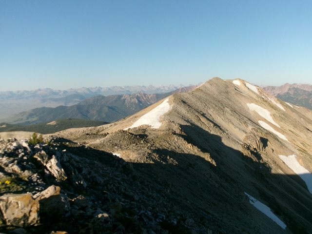 Meadow Lake Trail [(A)(6)(a) on Page 314 of the Book]. If you are not camped at the Meadow Lake Campground, park in one of the “day use” parking areas in the campground. This is the first leg of a 4-peak adventure that includes Peak 10723, Gilmore Peak (10,735 feet), Gilmore East (10,744 feet), and Liberty Mountain (10,216 feet). It covers 7.5 miles with 3,025feet of elevation gain round trip.