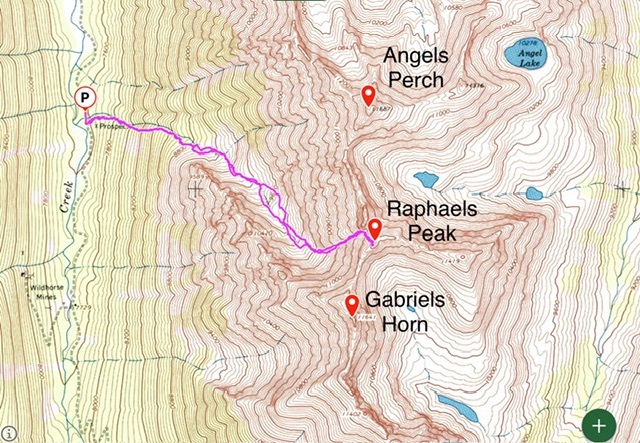 Raphaels Peak sits on the impressive ridge that divides Wildhorse Creek and Fall Creek. It is nestled into the ragged terrain between the Angels Perch to its north and Gabriels Horn to its south. USGS Standhope Peak