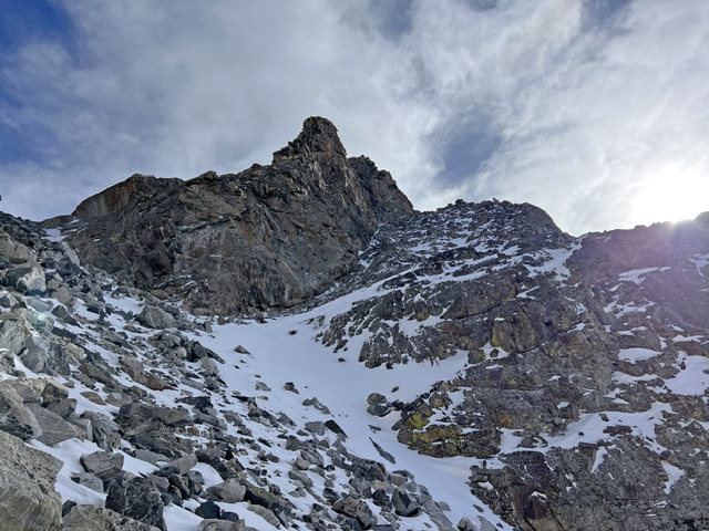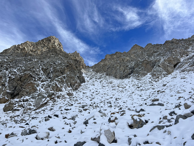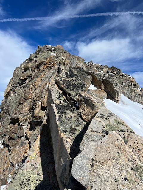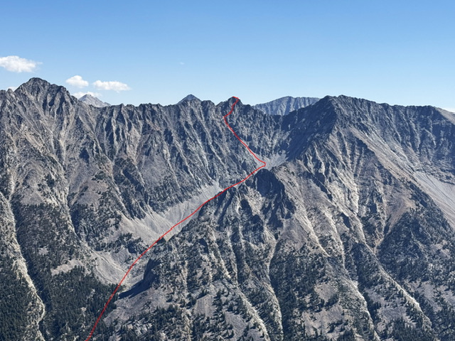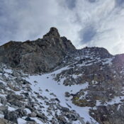 From Wildhorse Creek road, head east up into the forest at 7600’—due west of Angels Perch. Your route bends southeast above 9000’ as you follow the drainage. Above 10k’, a class-2 couloir eventually comes into view that will lead you to toward the summit. Just before the 11300’ saddle, head south and scramble up steep terrain toward the summit. You’ll top out just below the summit and will see the class-4 stretch that remains to get you to the top.