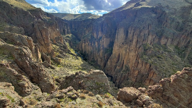 Looking down into Sheep Creek from halfway up. If not so chossy, I would return here to establish some climbing routes. Kaden Platt Photo