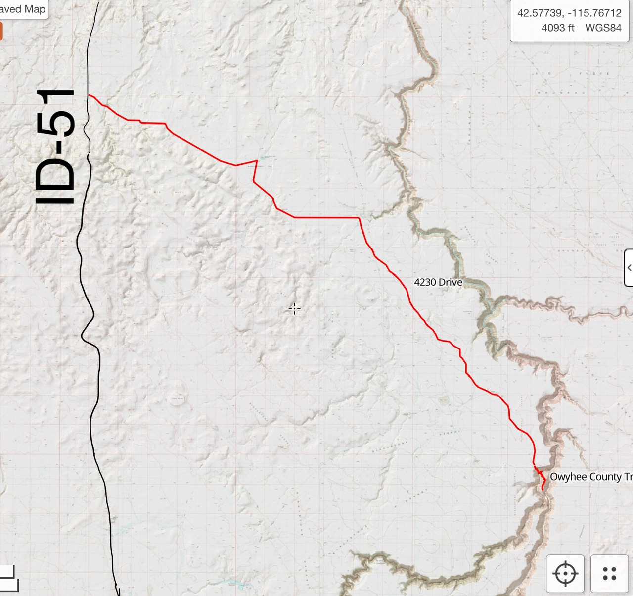Access to this peak leaves ID-51 at the signed turn for Missile Base Road. The road is gravel for much of the distance. It is 22.4 miles to the edge of the Bruneau Canyon. If the weather has been wet the area identified as White Lake becomes too deep to drive across. Also keep in mind that getting close to this peak requires good all terrain tires and decent ground clearance. At the end of the road, a faint trail heads down to Sheep Creek.