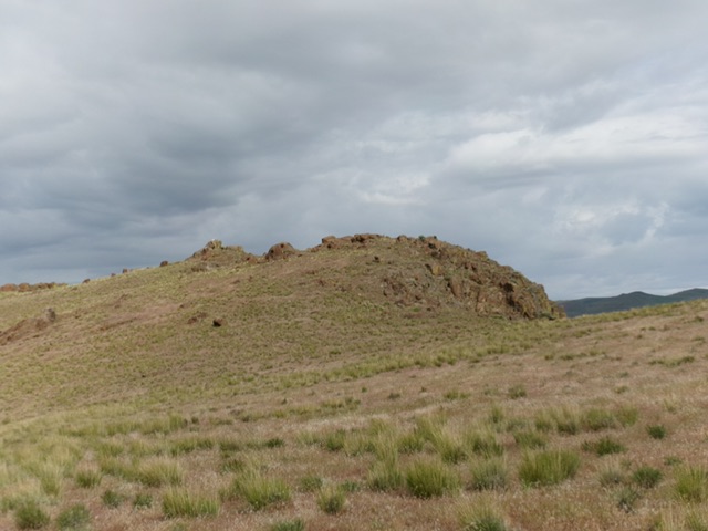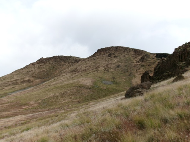 Stay to the right/east side of this gully in steep-ish but easy field grass and loose underlying talus. Cross the gully high up and move to its left/west side on a shoulder of sorts to reach the flattish summit plateau. The summit is still a good 0.3 miles away to the west-northwest. Descend 50 vertical feet on an easy, grassy connecting ridge to approach the summit. The summit block is obvious from a distance. Scramble up to the top of the highest boulder and sit/stand on it. When I descended from the summit, I stayed lower in the traverse back to Reynolds Creek Road. This was an easier, less rocky, and less angled line than my ascent route.