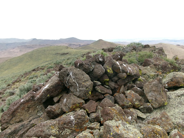 From the 4,820-foot connecting saddle with Windy Point, scramble south then southeast up a laborious ridge of boulders/talus and sagebrush to reach the rocky summit. Cross under a stiff, high cattle fence on the way.