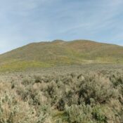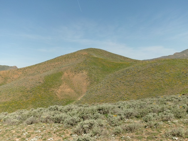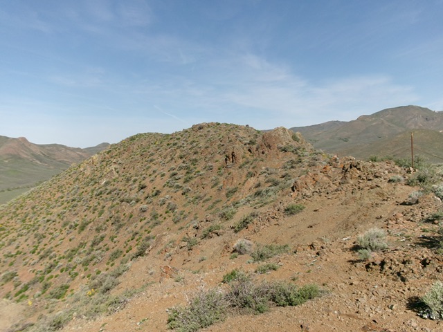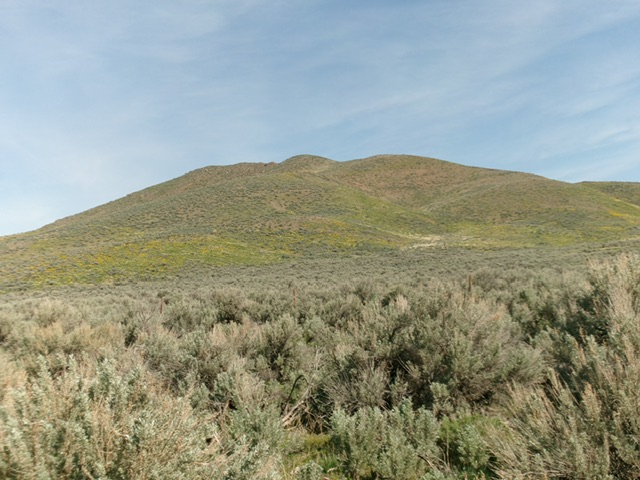 From the [lower] west summit hump, return southeast to a beautiful juncture with the south shoulder. This shoulder stays entirely on public land and leads directly south to the spot where I parked along Dry Creek Road. The terrain on the south shoulder is short scrub with some loose underlying scree. As you approach the valley floor (and Dry Creek Road), head left/southeast through tall, thick (but gapped) sagebrush to reach the open cattle gate and nearby Dry Creek Road.