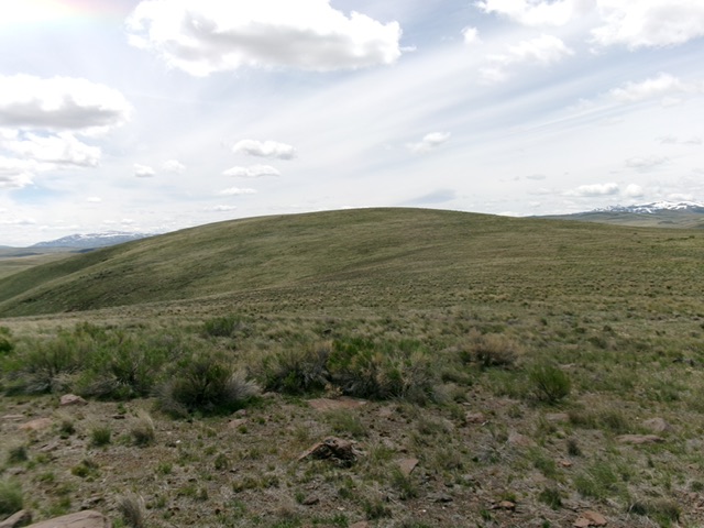 From the summit, return down the north ridge to the final ridge saddle, which sits at the head of a prominent dry gully to its left/west. Leave the ridge and follow this gully northwest then north. The gully terrain is initially sagebrush and then becomes clumpy field grass and clumpy dirt. When the gully bends right-ish/northeast, leave the gully and head north-northwest back to your parked vehicle along the spur road.