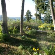 This is a brutal, steep bushwhack and I do not recommend it. The northwest ridge may be a better option; follow a game trail west up to the head of the stream drainage to reach the northwest ridge from the parking area. Now I will describe my punishing route. From the parking area, bushwhack south across a small stream (Tiger Creek) and then bushwhack south up a steep, thick, brushy face that is tedious.