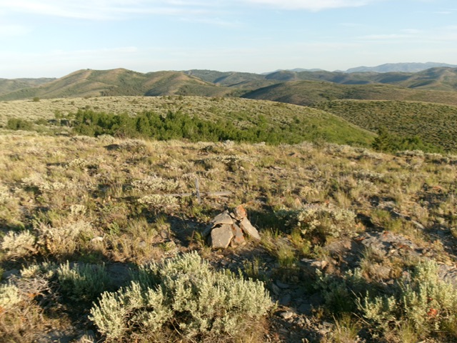 From the high saddle, bushwhack east up and over a minor ridge hump. Once past this hump, the summit comes into view. Continue east on the ridge crest and avoid the thicker sagebrush and other brush on the sides of the ridge and in the nearby gullies. The summit is open and easy. It has triangulation wood, wiring, and two pieces of rebar protruding from the ground. There was no summit cairn, so I built one next to the highest piece of rebar. I also stood on two boulders that are just east of the rebar and may be slightly higher.