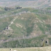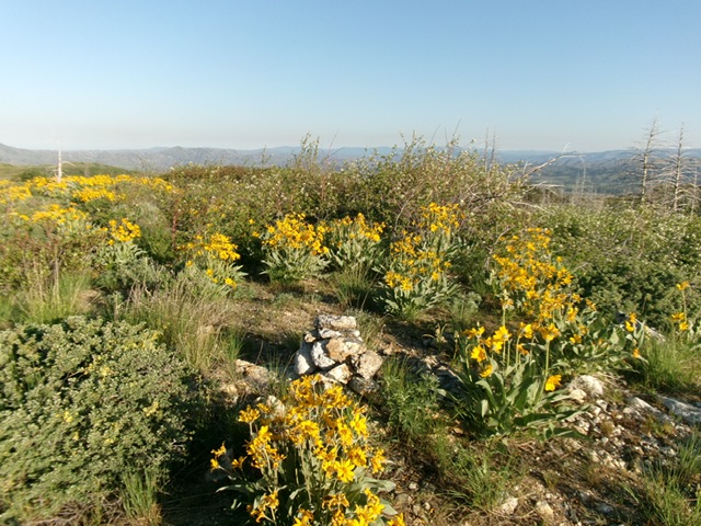 Turn right onto House Mountain Road and reset your odometer. At 0.3 miles, reach a signed junction with FSR-101 (left). At 1.9 miles, reach a signed junction with FSR-136 (left). At 2.4 miles, reach an unsigned junction with a jeep trail (right). Park at this junction or drive 1.0 mile on this narrow, rutted, overgrown jeep trail and park in a pullout [6,103 feet; 43°27’04.7”N, 115°28’56.7”W].