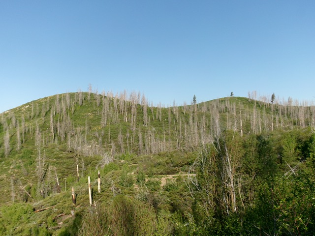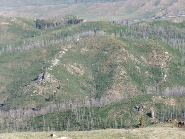 From the roadside pullout, hike west-northwest on the narrow 2-track as it weaves around three gullies to reach its end in just over a mile. There are lot more curves in the road than the USGS topo map shows. Ignore an unmapped southbound 2-track road in the final gully. From the end of the road, continue south up a good game/use trail until it soon ends. Bushwhack left/east up through thick brush to reach the brush-clogged northeast ridge crest.