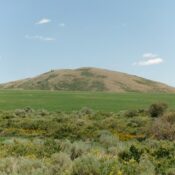 Same as for Buck Peak. Drive east on well-maintained Sagehen Springs Road. Go right/southeast at an unsigned junction. After about 2-1/2 miles, the road becomes a narrow 2-track road and crosses private land to reach BLM land in Hillhouse Canyon. The road reaches an unsigned junction in Hillhouse Canyon. Go right/south here and drive 100 yards to a large, rusty water tank. Park in a grassy pullout across the road from the water tank [5,936 feet; 42°19’57.7”N, 112°44’59.6”W]. This is BLM land.