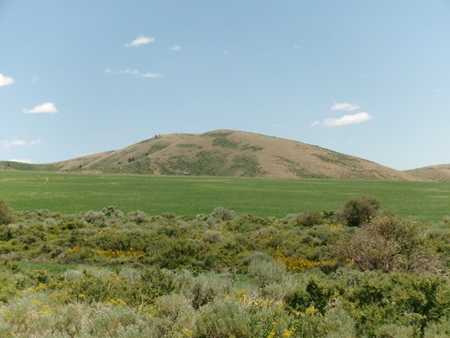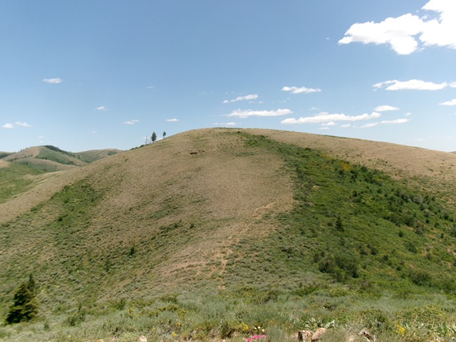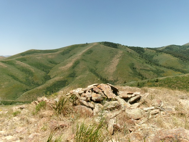 From the roadside pullout, bushwhack southeast through thick scrub (with gaps) to quickly reach short grass/scrub. Scramble southeast up to the ridge crest then head left/east up to a false summit hump. Drop 65 vertical feet in thick-ish sagebrush and other scrub to a minor saddle. Continue east up easy, short scrub to the rocky summit hump and large summit cairn.