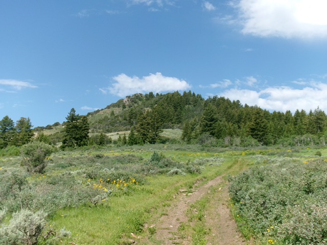 From the summit, bushwhack east then northeast (a little) to reach Smith Canyon Road at its crest and the old, short spur road (shown on the USGS topo map). This spur road seems to be on public land (or public access is allowed on it) but there is posted, private land just to its north. Once on Smith Creek Road, walk 0.3 miles north then northeast down into Deer Creek Canyon to the junction with Wolverine Pass Road and your parked vehicle. Please note that IF the aforementioned spur road IS on public land (or is publicly accessible), it makes for a better spot from which to climb Peak 7180 and Peak 7135.
