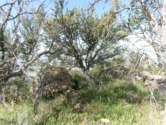 From the 6,660-foot connecting saddle with Peak 7180, head right/southwest through thick-ish sagebrush and other brush to reach a ridge of sorts. Scramble southwest up this steep-ish, forested ridge in mountain mahogany with some open areas of scrub. The ridge bends left/west to reach the small summit area. A pair of boulders is probably the high point but there is also a large boulder about 30 feet to the east that may be the high point. Stand atop all of these boulders “just to be sure.” There is no summit cairn but this is clearly the high point of Peak 7135.