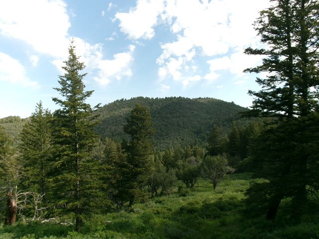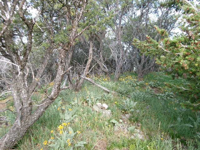From road junction, walk about 100 yards southwest up Smith Canyon Road. Leave the road and bushwhack west up into a forest of pines and mountain mahogany and quickly find a ridge. Follow this ridge west then northwest to a minor hump. This ridge is better defined than the USGS topo map suggests. The forest is mostly mountain mahogany (tedious and somewhat thick) with some junipers and scattered pines.