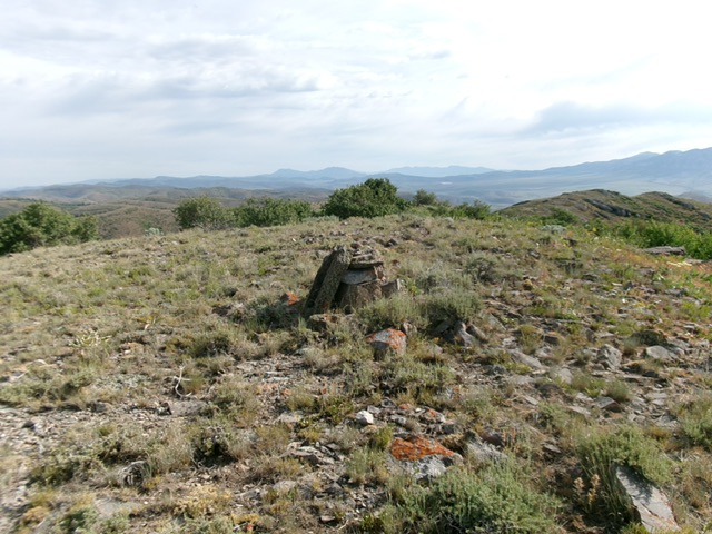 Leave the road to pass the water tank and cross an old cattle fence, dropping 15 vertical feet on the way. Bushwhack northeast straight up the hill to the summit. The sagebrush and other veg is thick but there are gaps and old cattle trails to help you reach much easier, shorter, gapped scrub midway up the face. The summit is bare and has a decent summit cairn.